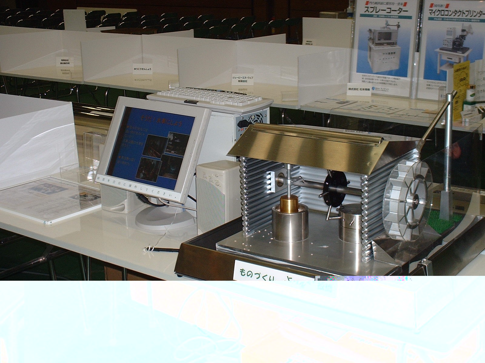 2003年11月13日〜15日に東板橋体育館において、今年も「いたばし産業見本市(第7回)」が開催されています。 左・下はそのときのMNI(ものネット板橋)のスナップで下記が展示されています。 ・プリントバッジ(その場で撮影) ・総金属製水車小屋 ・電子ホタル ・健康ランプ(消臭効果) ・空見ちゃん(紫外線検知カード) ・アルソルダー(アルミ半田付装置) また「立川工業会」の展示も同じブースで行われています。 ぜひお出でください いたばし産業見本市 板橋商工会 |