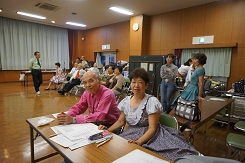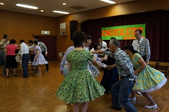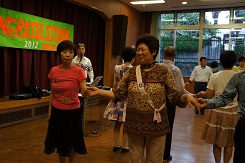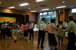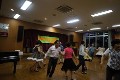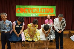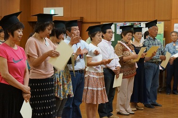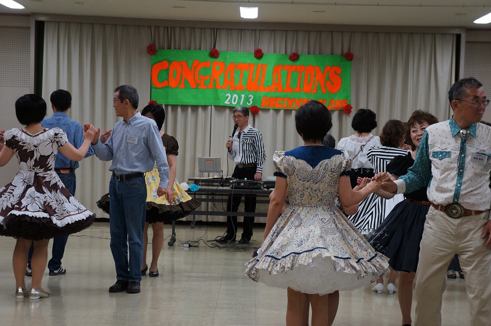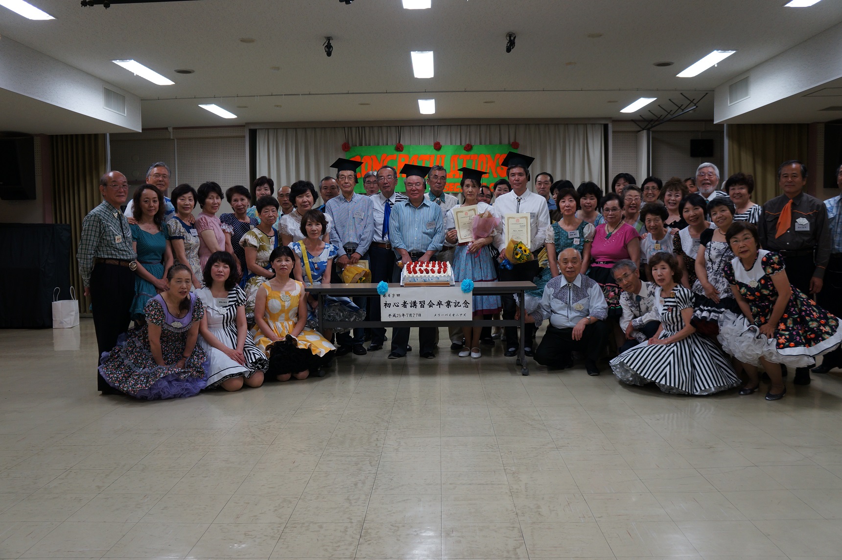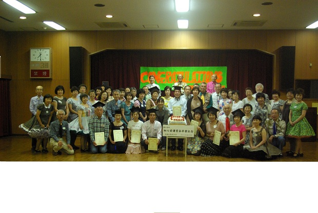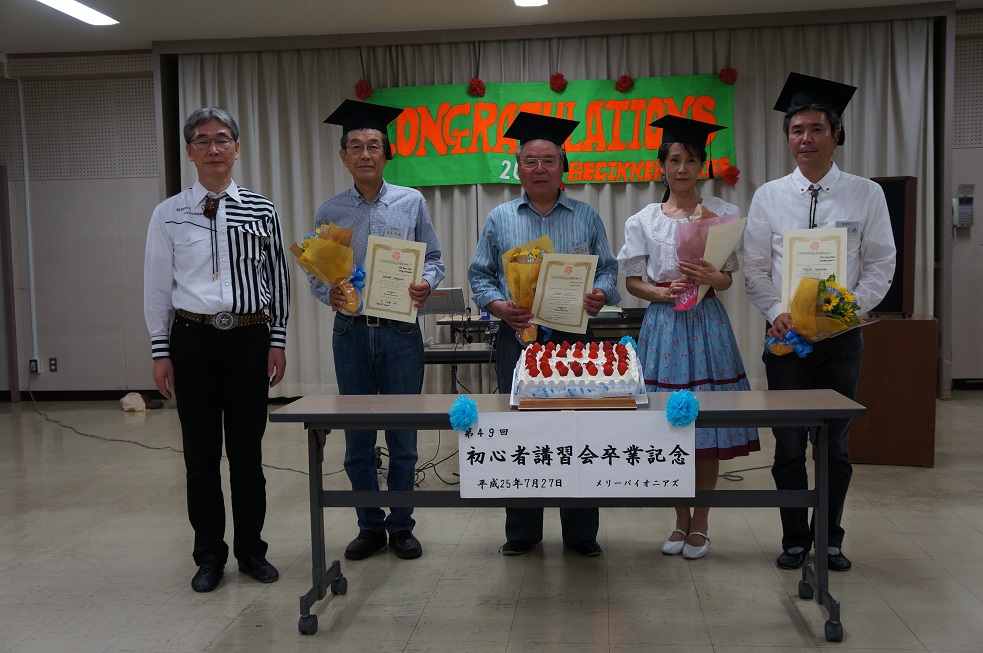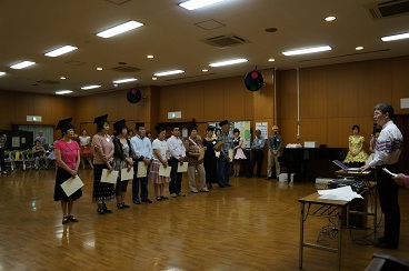 平成25年7月27日(土) 林間学習センター 4月から始めた講習会も無事卒業式を迎えました。会員の拍手により成果発表の踊りを終わり小塚春日さんの司会によるセレモ二ーを行ないました今年の卒業生には特別に花束贈呈もありました。